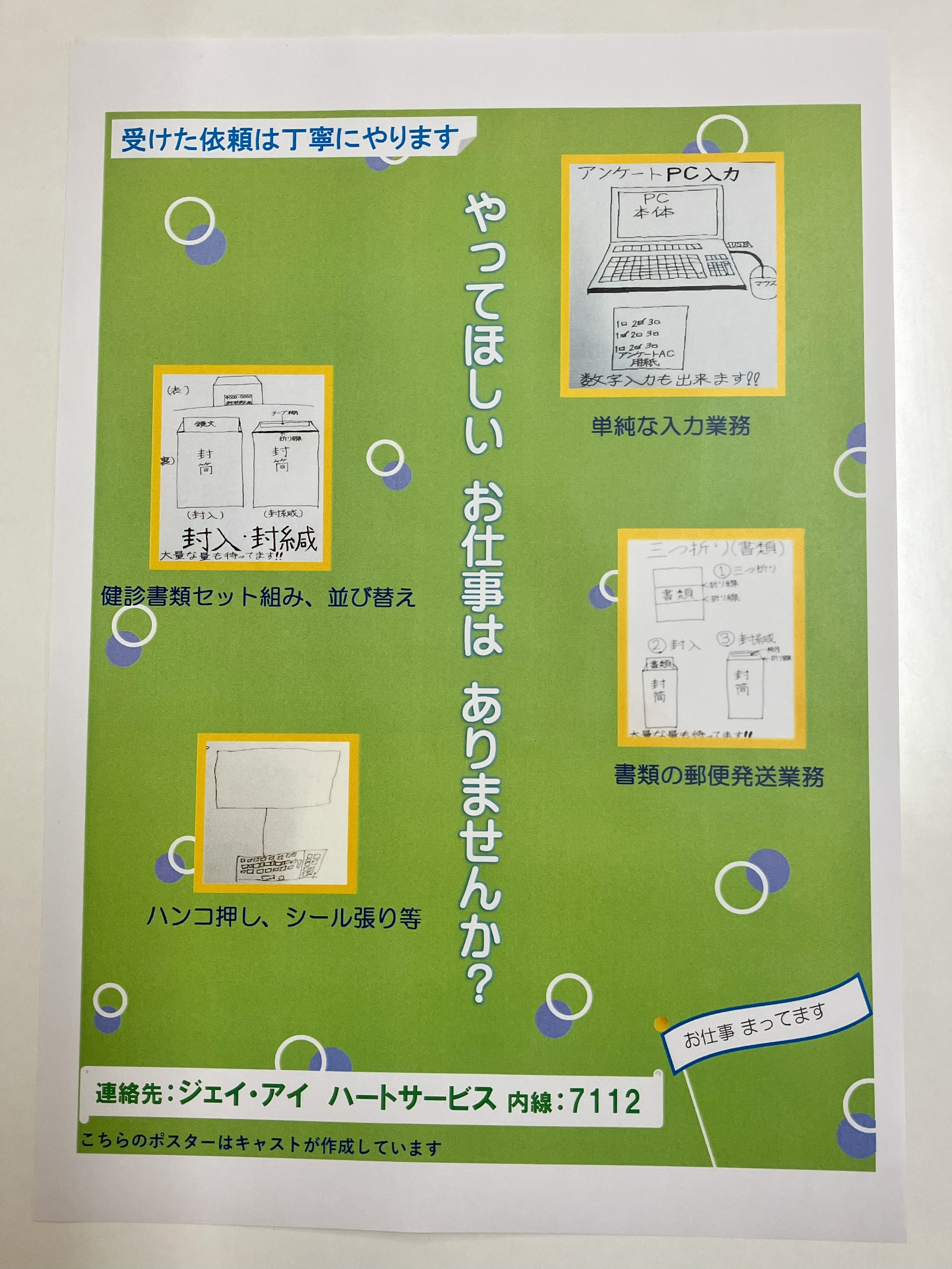 脱紙化で業務が縮小傾向にあるため、新規業務開拓を目指し、キャストで力を合わせポスターを作成しました。キャッチコピー『やってほしい お仕事は ありませんか?』も、みんなで意見を出し合い、キャストUさんのコピー決定。(ホームページの画像では判別が難しいですが、)業務のイラストはキャストのTさんとSさんが描き、ポスターに仕上げる画像編集やデザインははYさんがPCで担当しました。外来センター地下1階の掲示板に2パターン展開中です。